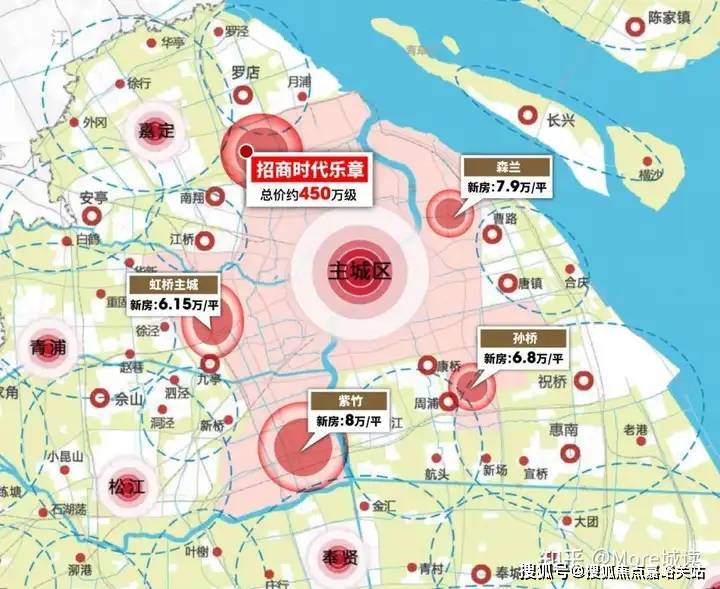 如今,主城区板块内的虹桥、高行、紫竹等区域,单价起码都是6万+。就连顾村也已经出现了均价约6.38万/㎡的新房,招商时代乐章过会均价只有4.8万/平方米。