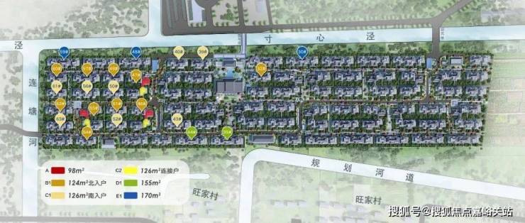 产品为建面约98㎡、124㎡、126㎡(南/北入户)、126㎡(连接户)、155㎡、172㎡合院。