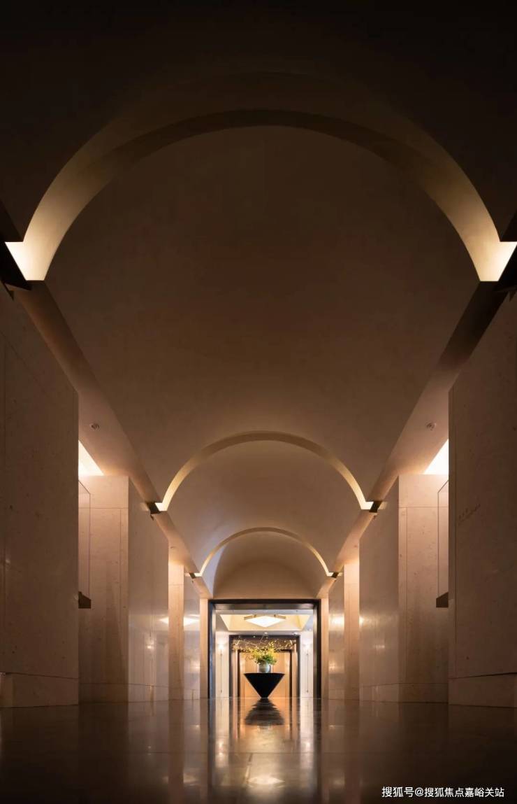 大堂整体挑空14.5米 ,两侧通体象牙质地色泽的大理石铺面,结合竖向灯带, 归家的仪式感被拉满。