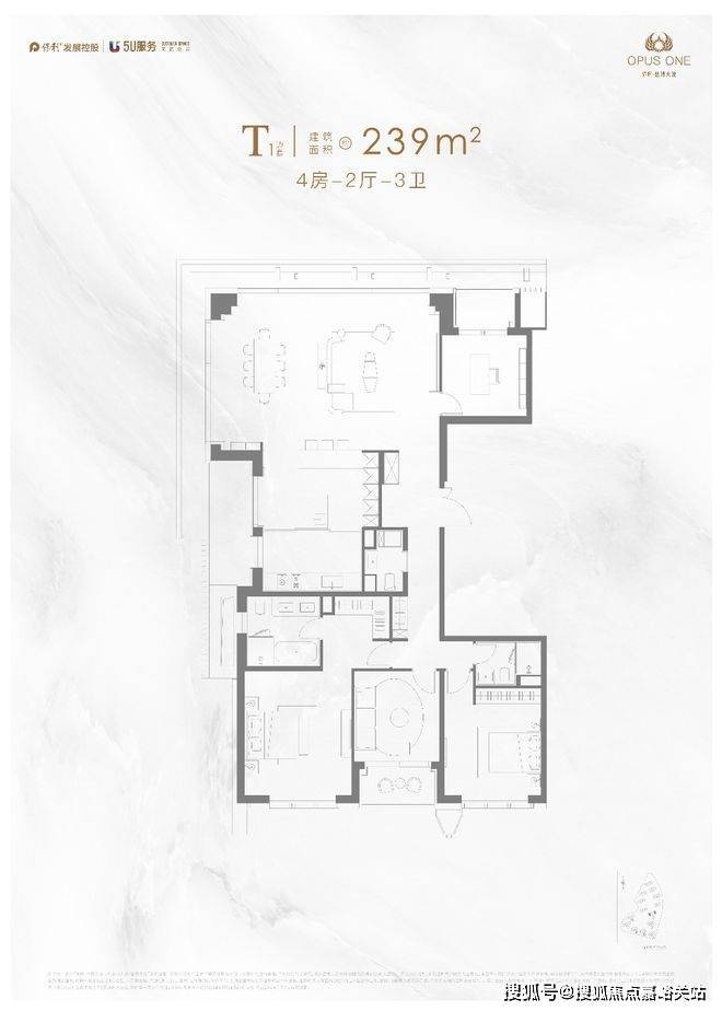 ⑤OPUS ONE 500空中行宫:4+1房&双豪华套房规制、2梯1户超大专属电梯厅、超大宴会厅、5个阳台、独立内玄关、阳台、起居厅、步入式衣帽间、双台盆浴缸卫生间、灵活X空间;