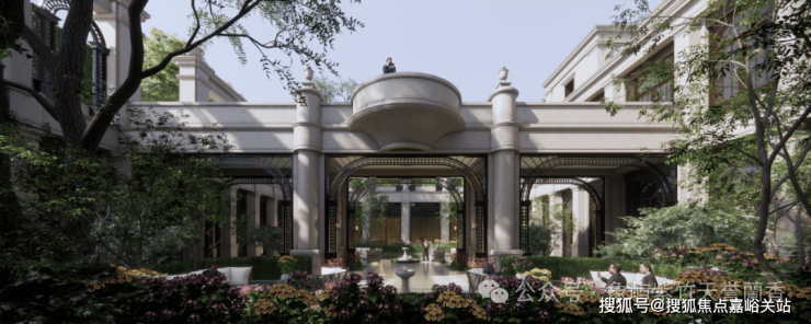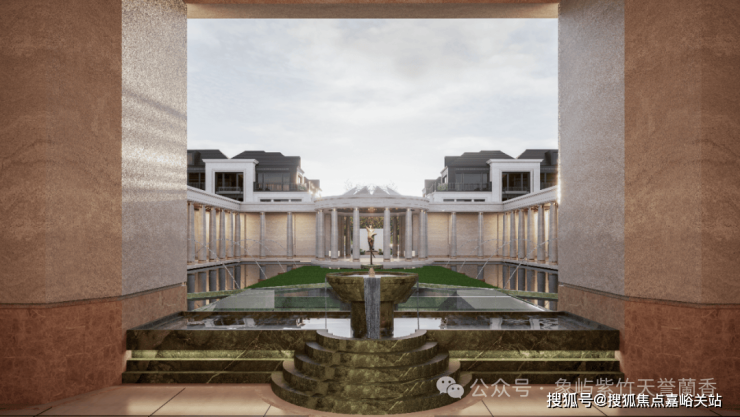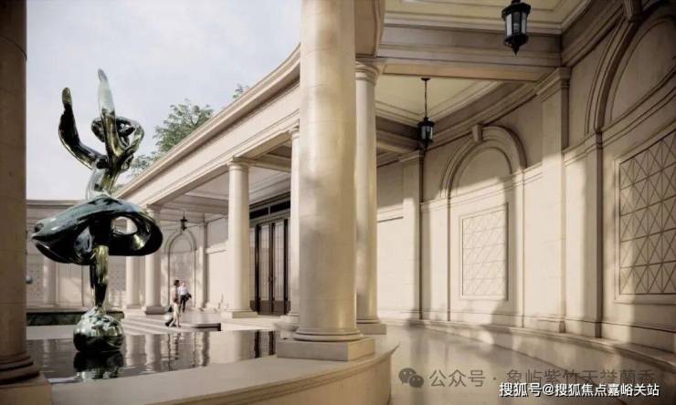 项目南门 以凡尔赛宫三泉林为蓝本, 36米煊赫门庭搭配宝格绿水景,入口处的石材雕花由匠人纯手工雕琢,每一道纹路都还原法式宫廷的庄重与优雅!