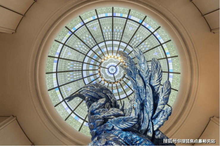 推开大门,你很难不被这份海派艺境所打动,约9米挑高迎归大堂随后映入眼帘,彩玻穹顶之下,是一尊名为 “百羽栖澜”的艺术雕塑,由当代艺术家蒋乃骏大师、非遗大漆传承人巴忠天大师跨界共创,打造出艺术馆级的归家体验,这是一份属于上海、属于建发海宸的浪漫。