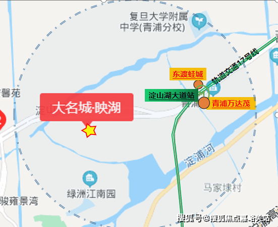 「大名城 映湖」离17号线地铁的淀山湖大道站不算太远,百度地图测距约2300米。