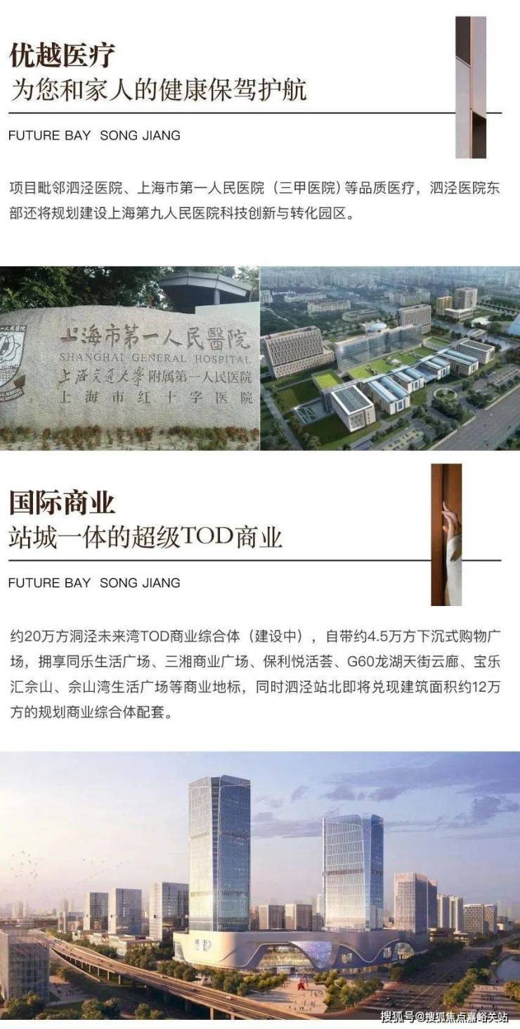 【国际商业】洞泾未来湾TOD商业综合体(建设中),商业总面积不低于20万方, 自带约4.5万方下沉式购物广场,定位中高端的区级商业中心,现已全面开始建设招商。拥享三湘商业广场、保利悦活荟、G60 龙湖天街云廊、宝乐汇佘山、佘山湾生活广场等商业地标,同时泗泾站北即将兑现建筑面积约12万方的规划商业综合体配套。