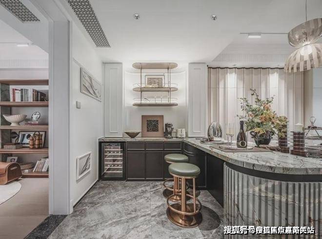 更好更奢的归家门庭,嘉佩乐酒店风格,海派元素充满空间的每一个角落,地面的复古花纹,金属镂空装饰墙,普拉达绿的奢石点缀,仿佛穿越到了摩登时代。
