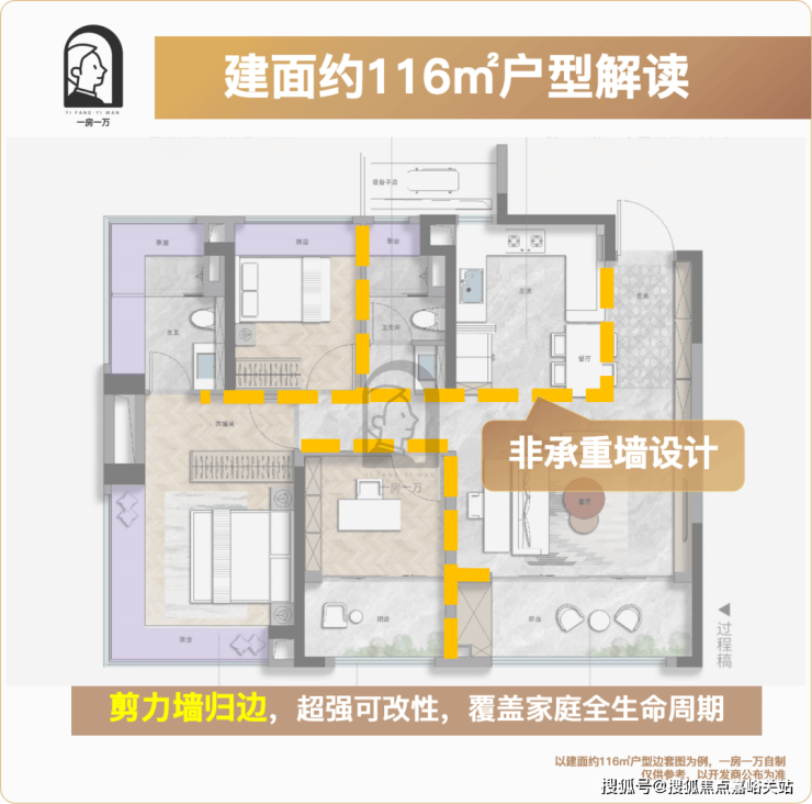 “剪力墙归边”——-它意味着 室内极少梁柱干扰, “设计的不是一种户型,而是N种人生的可能性。”