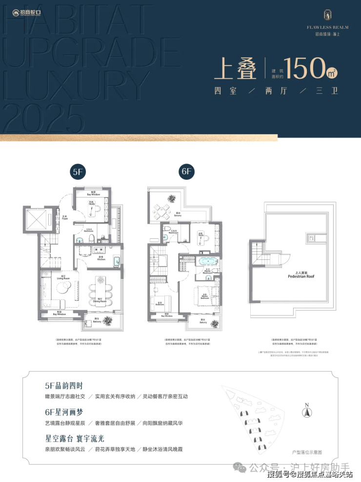 建筑面积约150㎡上叠整层主卧增设优化,自带书房+南北露台,顶楼设有大尺度可上人屋面,既可与亲朋欢聚畅谈风云,也可莳花弄草独享天地。
