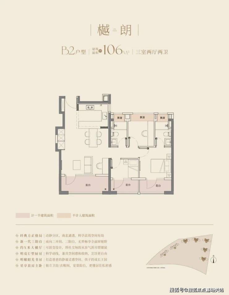 建面约106㎡的三房两厅两卫, 3.5开间朝南,南向面宽达到约11.8m! 碾压市面上以前的三开间朝南、10米面宽的三房户型。