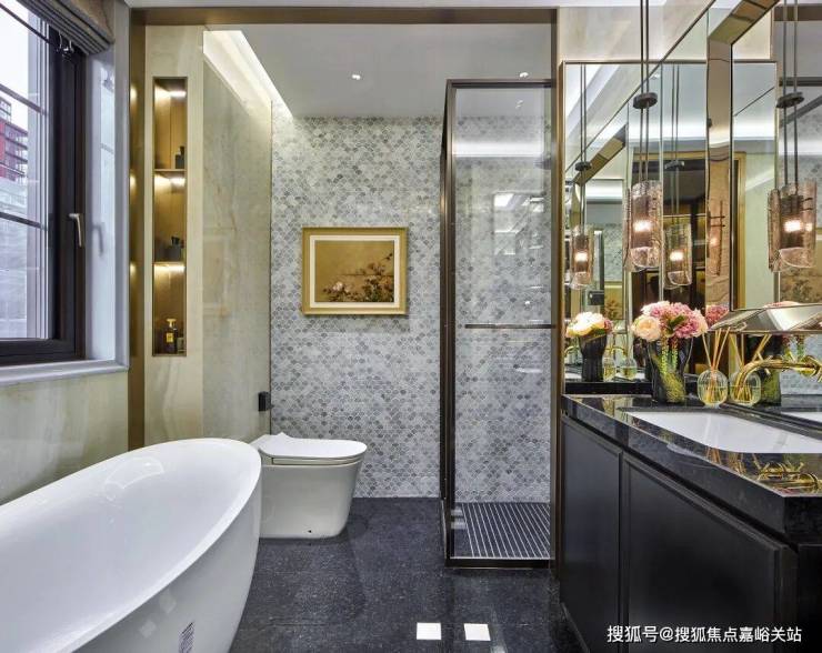 地面延续酒店式落客区海棠纹拼花镶钻,铁打纹工艺,其间还有老石板,青石板,中国黑老石皮,柏坡黄的石皮等原石原面铺装,老石皮从大料里取出,数量少而贵,由此也可看出保利·永兴里在别墅打造上是真舍得,也是真高级。