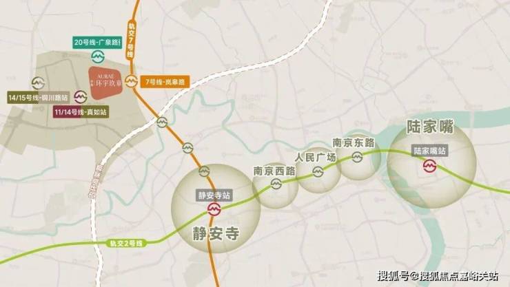 五轨交汇: 7、11、14、15、20号线(在建中),4站静安寺,5站中山公园、7站人民广场,半小时内覆盖上海核心商圈