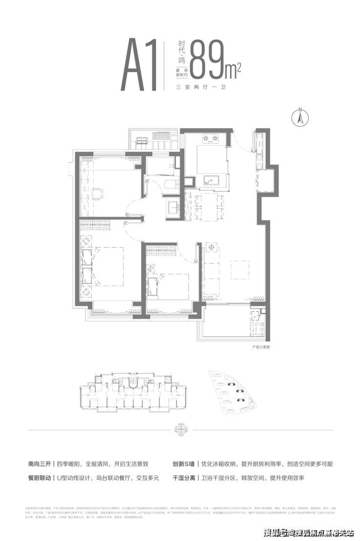 建面约89m²三房两厅一卫户型,LDKB一体化设计,南向三开间布局,全明空间设计。让四季流转于生活之中,用自然营造生活的惬意。