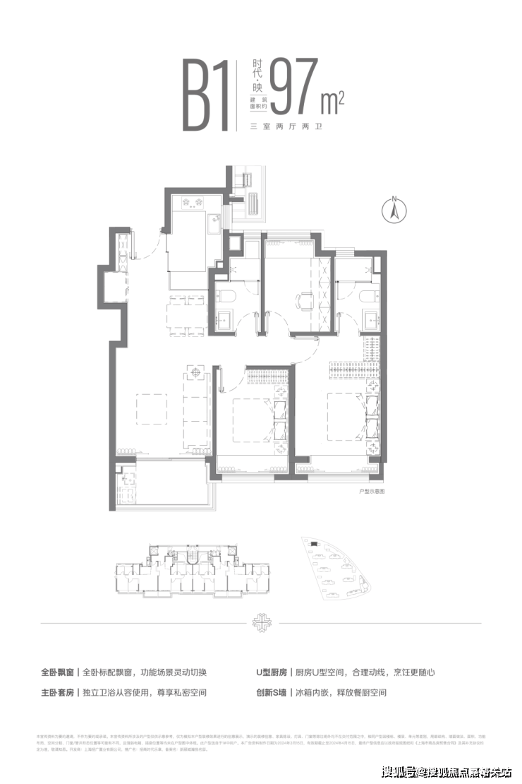建面约97m²三房两厅两卫户型,全卧+主卫飘窗配置,并通过飞机户型空间布局,提升了空间的使用效率,让温情在自然中自然发生。