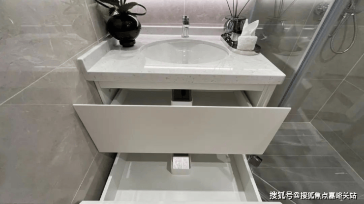 卫生间洗手池下的空间向来是卫生死角,还有弯曲的水管绕来绕去。项目却别出心裁地将这个死角做成了储物柜,充分利用空间。