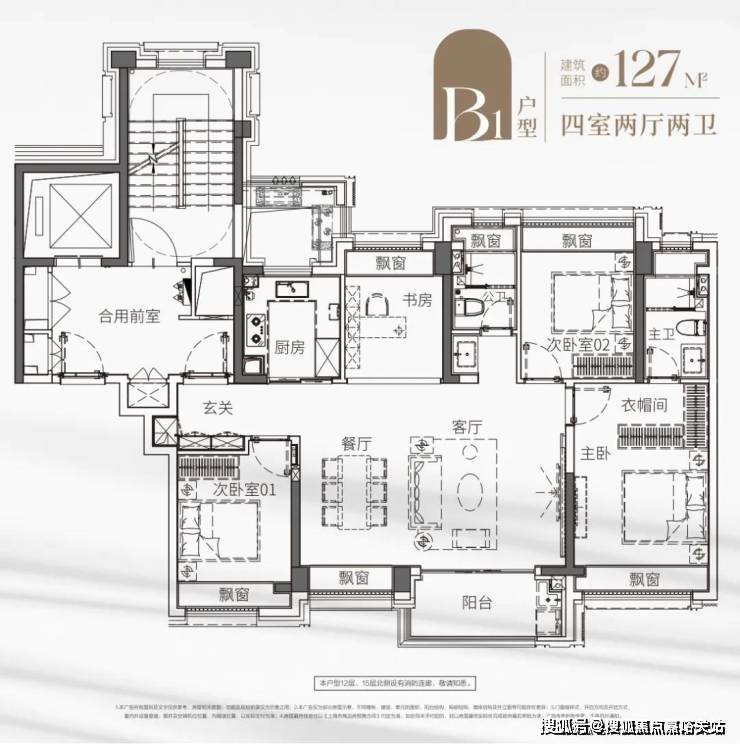 来看看更大一点的户型—— 建面约127㎡超阔四房,同样是 南向横厅设计,并拉伸至4开间,空间舒阔。 主卧套房设计,也有足够的收纳,打造专属秀场。