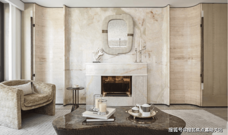 以整块奢岩破题,以皮革融入, 白金沙岩板 、 140户型采用 罗马白洞石岩板 , 主卧背景采用了车线工艺硬包,将豪宅标配升华为材质的史诗。