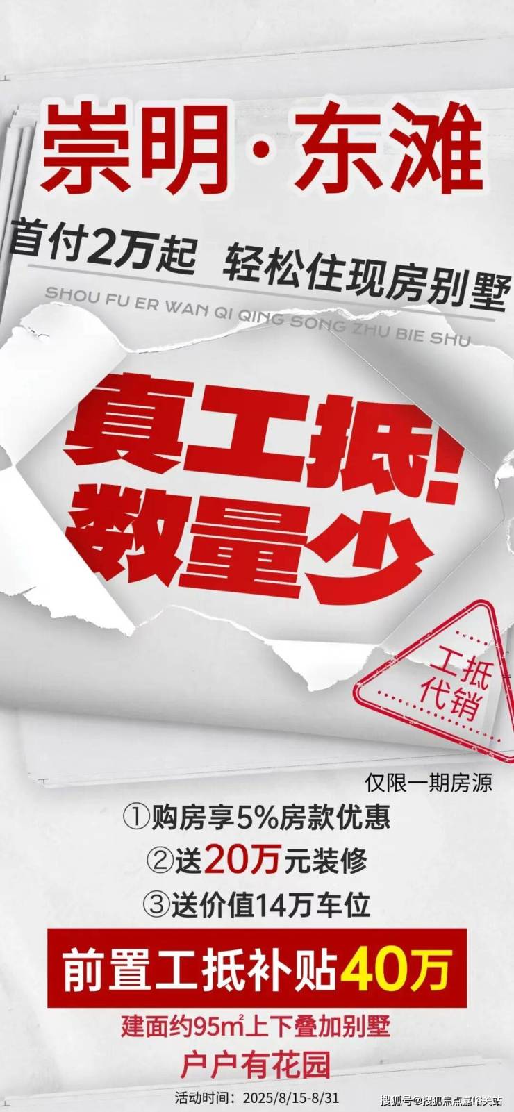 崇明东滩 品质住宅「东滩海上明月」主推建面约95㎡-150㎡叠墅!直降90W+95折!248万买别墅+送车位!优惠力度非常大!目前房源充足!二期加推168套建面约95㎡叠加别墅;均价3.36万/㎡认购金25万;认购时间5月29日-6月2日