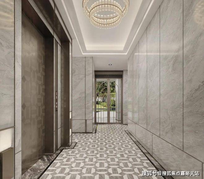 再次,项目首层大堂与电梯轿厢品质感拉满。首层入户大堂,石材搭配金属装饰条的地面、墙面,空间宽敞气派,质感十足。