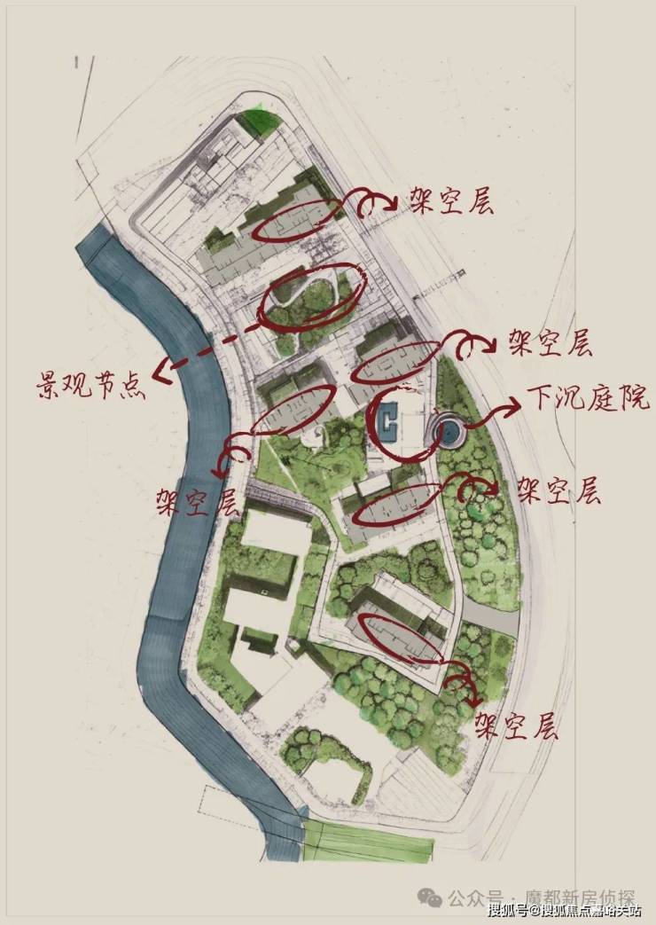 超高的架空层,将社区内核心景观视野,尽收眼底,不断洄游且连续的漫步动线,视觉形成了连续的感官通廊, 视觉和路径上,对于景物的情感,连续不断,且移步异景。