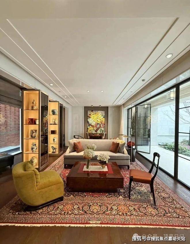 正式的大沙发区域,灵活散座区域,家具注重收藏种类多样性,中式圈椅,西式小沙发,灵活移动,根据需求可聚可散。手工编织的复古羊毛波斯地毯,用植物和矿物天然染料来进行染色,拥有了抗衡时间侵蚀的美,更增加了收藏的丰富性,是高品味的体现。