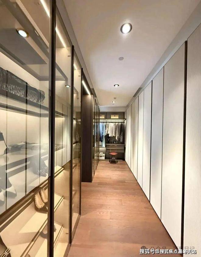 步入式衣帽间隐于卫浴内部,创造出一体化体验,金属质感的柜体材质,与卫浴石材形成对比,增加了视觉的丰富性。