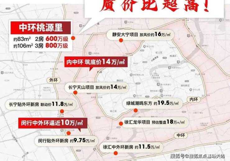 再看中外环,徐汇、长宁项目11-12万/㎡,闵行楼盘都要逼近10万/㎡。