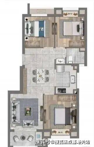 但这个户型是洋房产品,得房率很高,再加上层高约3.1米,室内丝毫不见局促感,很符合三口之家偏改善或者是二胎家庭的居住需求。