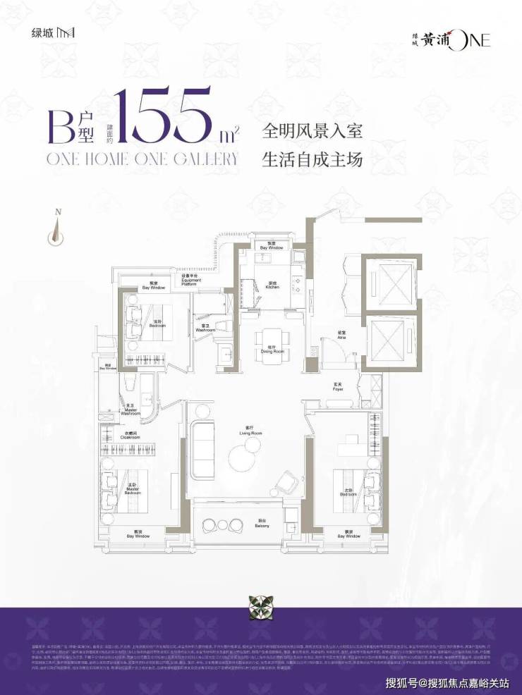 建面约155平方米三房采用三开间朝南设计,配备6米景观阳台,主卧豪华套房设计,兼顾私密性与居住舒适度^。该户型为南北通透的飞机户型,非常方正,客厅面宽达5.3米,连接约8平方米的朝南阳台,采光和视野极佳^。餐厅与客厅相连,厨房配备加格纳六件套橱柜,操作动线合理^。两个卫生间均为明卫,且都配备了当代、劳芬等一线品牌的卫浴设施,其中一个卫生间采用干湿分离设计,方便使用^。两个朝南卧室和一个朝北卧室均带有飘窗,增加了使用空间和采光效果^。