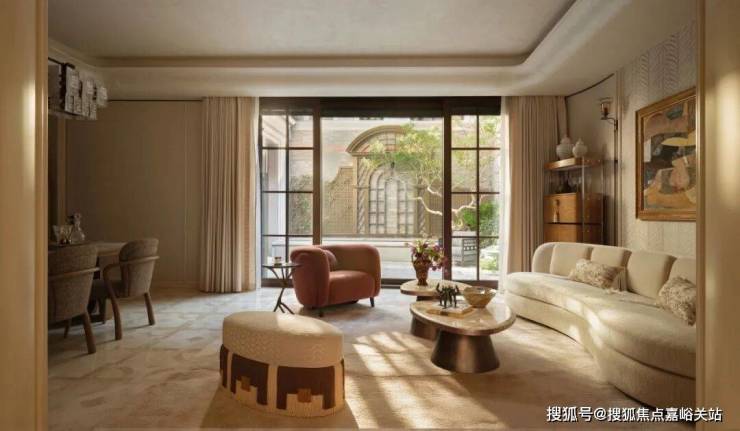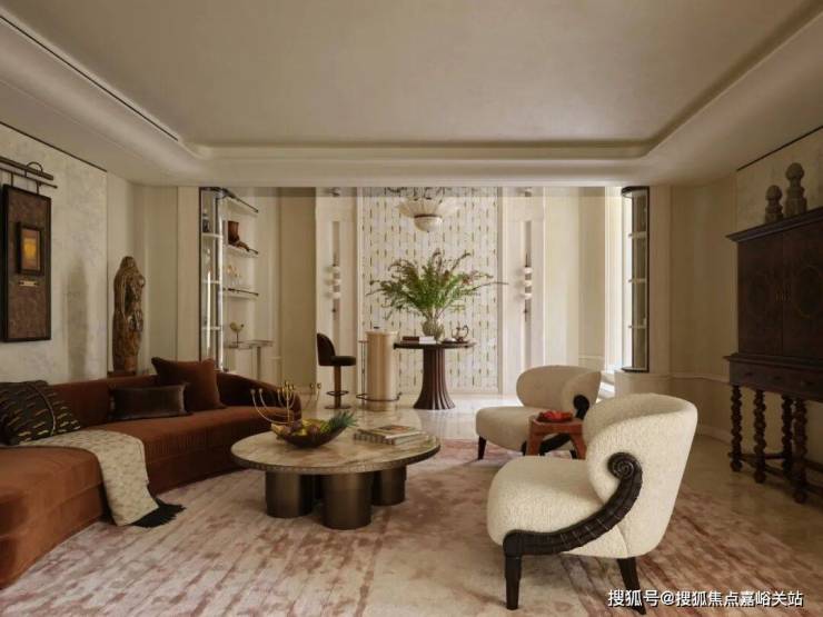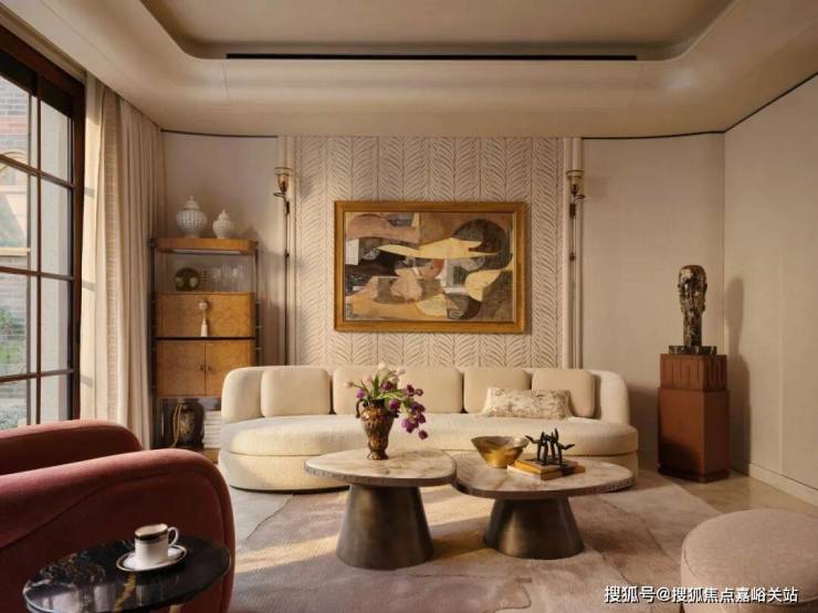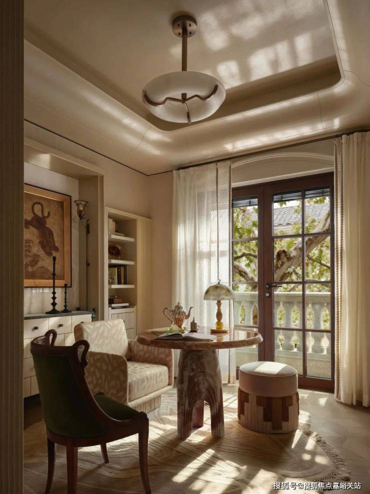 再看家具的布置,很随性。厚重的丝绒窗帘、铆钉装饰的沙发,再加上几处闪着暖调光泽的铜点缀,所有这一切都被午后那种柔和的光线笼罩着,重现了19世纪巴黎那些文艺聚会里特有的那种不被打扰的、文雅的氛围。