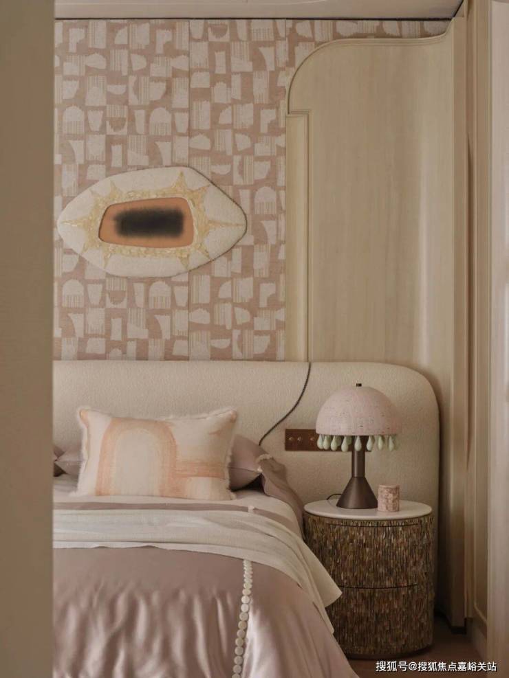 主卧室的格调,完完全全是法式的优雅。像是用了那种贵气的“树瘤”木料,还有像魔鬼鱼皮一样质感的装饰面,一看就很有格调,透着那种老派的讲究。墙上那幅名叫《心途》的画,把两个人这些年来交织在一起的人生路,最终画成情感句点。