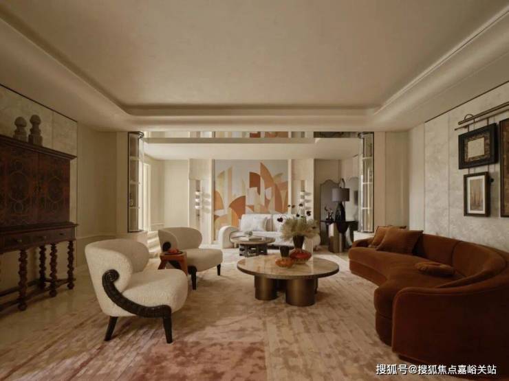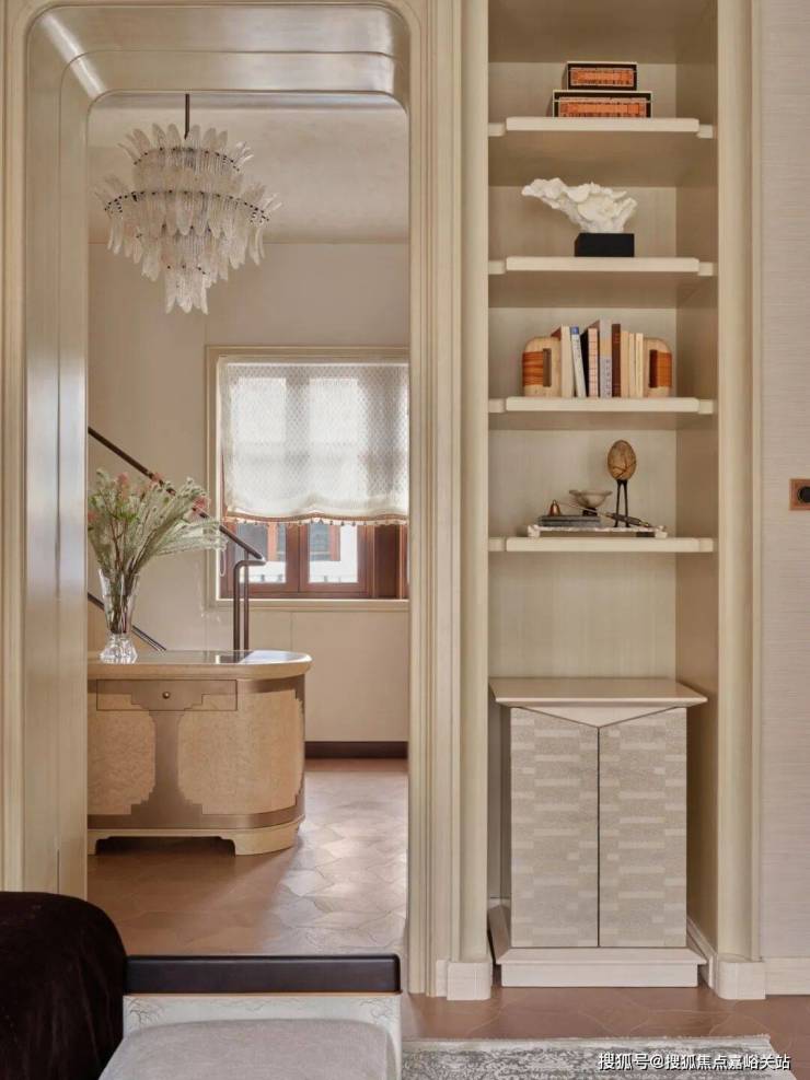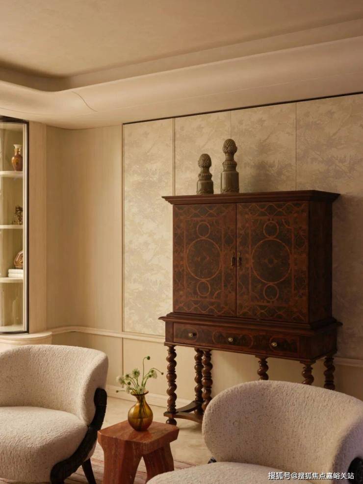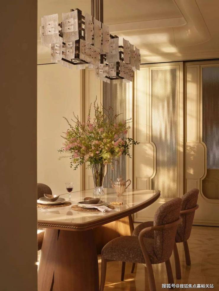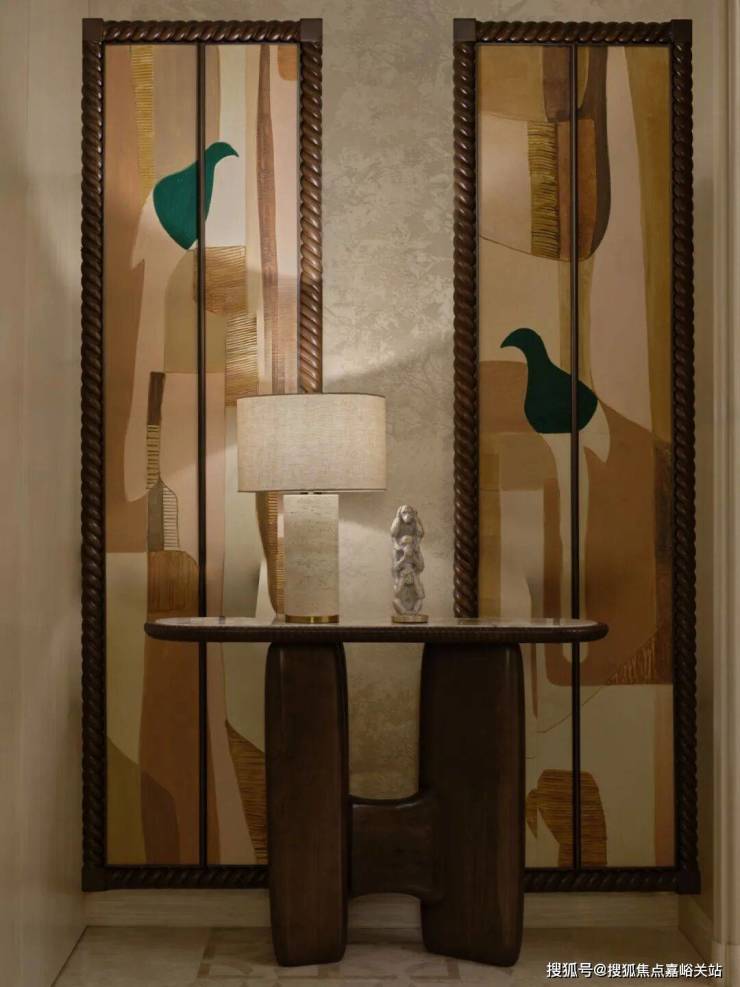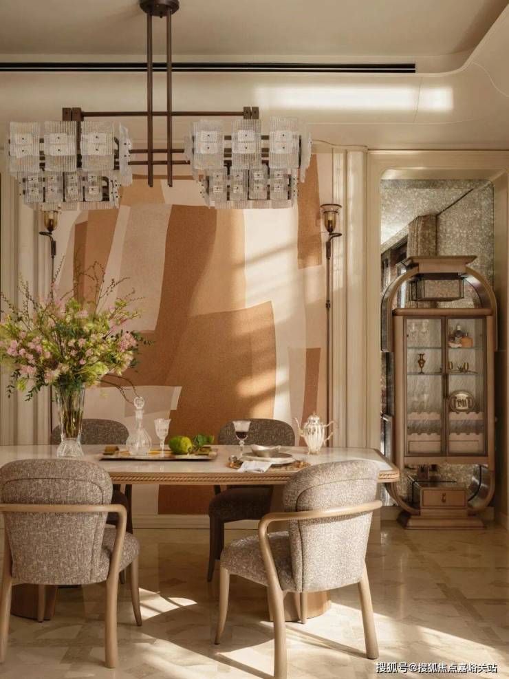 进门那一刻,一幅名为《Flame》的大漆画,那抹鲜明的红色立刻吸引了视线,带来了回家的第一个温暖信号。那用古老技法一遍遍打磨出的温润质感,与天花板上法式水晶吊灯流转的光彩交织在一起,仿佛让东方的传统手艺和西方的华美装饰,在这里打了个招呼。