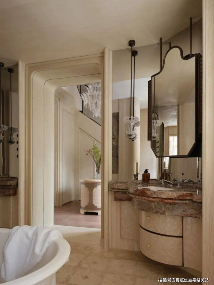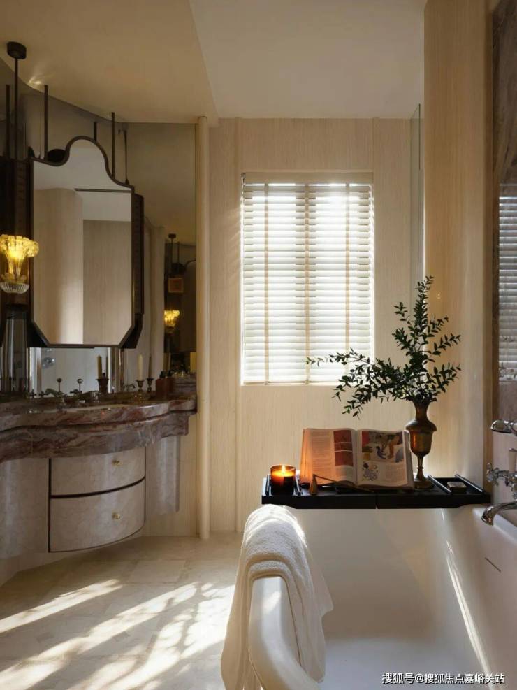 走进主卧配套的卫生间,就能感觉到一股怀旧的味道。墙面和台面用的暖色调大理石,让整个空间都显得特别沉着、有气质,让人完全放松下来。
