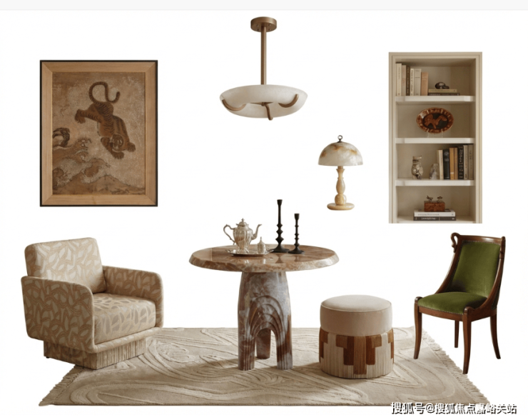 丝绒面的沙发,配上像玉石做的茶几,还有那盏手工做的玻璃灯,再加上几件从国外淘回来的老物件⋯⋯这些东西,来自不同年代,摸上去感觉也不一样,但放在这个房间里,却特别搭,一点也不冲突。