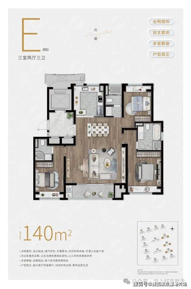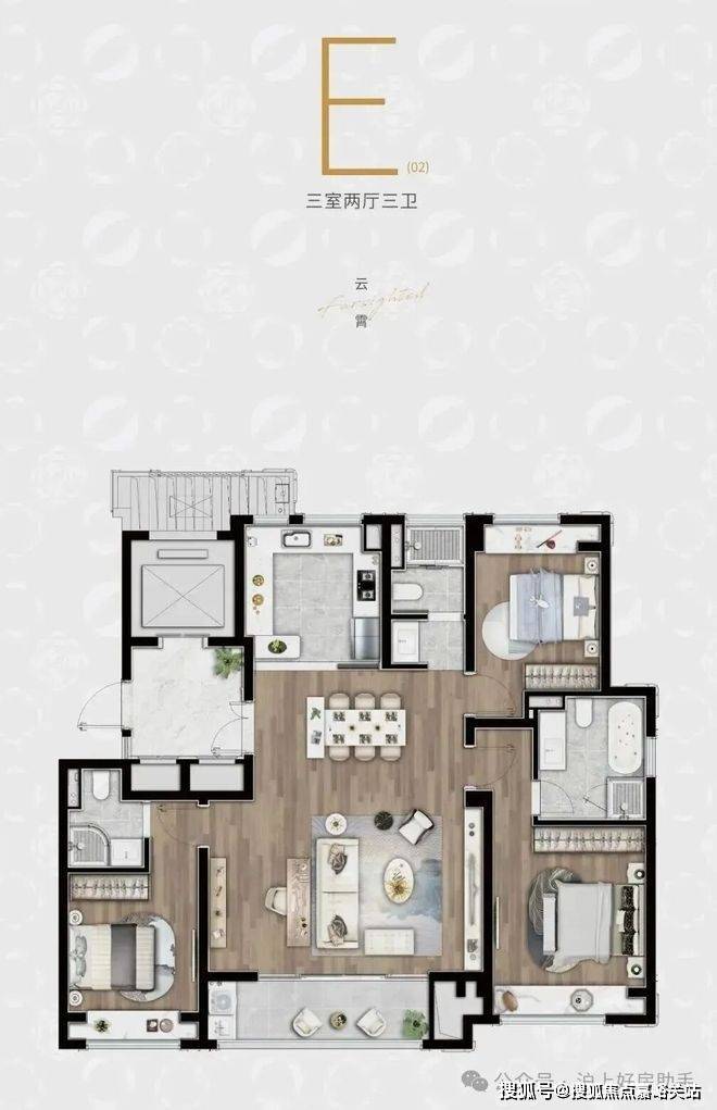 约98㎡3房2卫户型,三开间朝南,并且这贯穿客厅+次卧的超大阳台实在是惹眼,这个南向的视野延展度以及采光度相比同级别的户型来说,要更加出色。