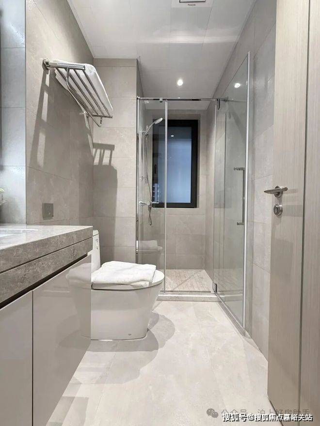 另外,一般百平米主卫淋浴房都是钻石型的,但项目是“一字型”的。“一字型”相比“钻石型”,洗澡空间更大,哪怕带着小朋友也不用挤得“转圈圈”,舒适度提高了不止一点点。