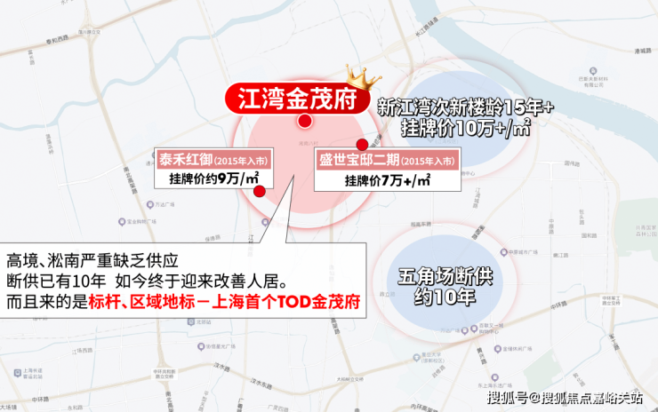 宝山东部片区上一次供应还要追溯到2015年的泰禾红御和盛世宝邸,几近10年断供,这两盘也是目前区域标杆,前者挂牌近9万/㎡,后者7万+/㎡。五角场同样如此,近10年断供;而新江湾次新房龄普遍15年+,挂牌价10万+/㎡,总价很高。