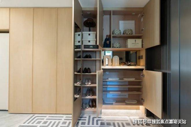 不管是小碗、大碗还是其他特殊餐具,都有不同的大小规格的抽屉可供整齐的摆放。让整个厨房的空间,得到充分的“扩容”。满足业主对于烹饪、收纳的所有需求。其次还有玄关部分: