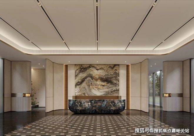 顶部采用香槟金色的斜角造型铝板,搭配手工打磨的星空顶及氛围灯,地面铺设仿石砖,墙面基调则借鉴了华尔道夫酒店的浅米黄色系大理石,并配以精致的礼仪灯设计。不管是用料、颜值、审美力,都展现出了星级酒店式的尊贵归家仪式感。