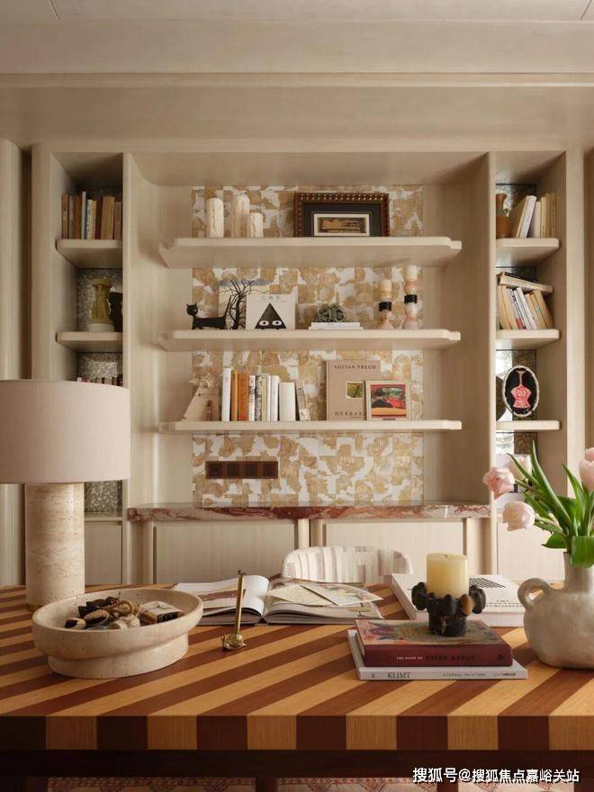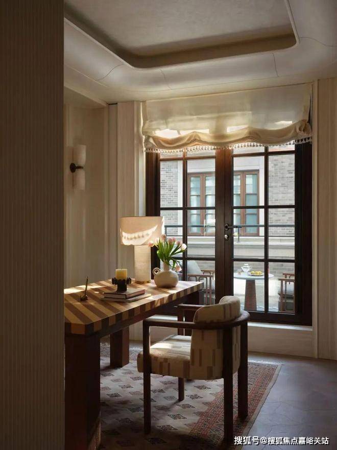 在弘安里,二楼亲子书房内,✨✨✨【弘安里】售楼处电话:4001185086✔✔✔❤❤❤加宽胡桃木书桌便于共读,✨✨✨【弘安里】售楼处电话:4001185086✔✔✔❤❤❤中古烛台与装饰画《庇护所》相映成趣,延续着“崇文重教”的家风。