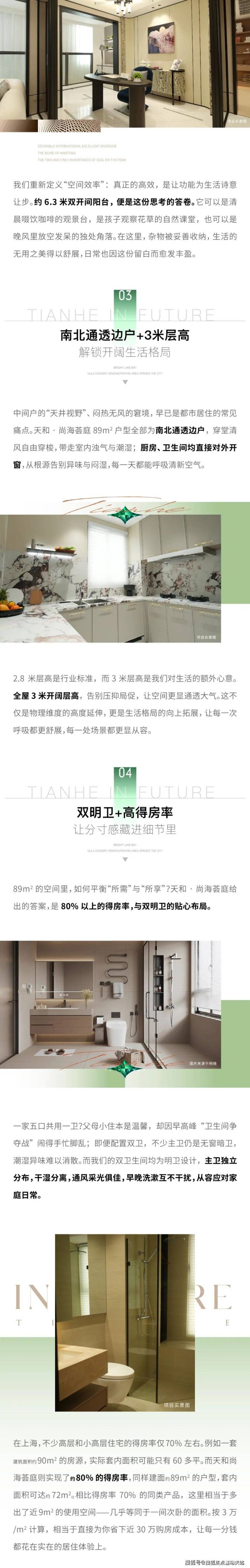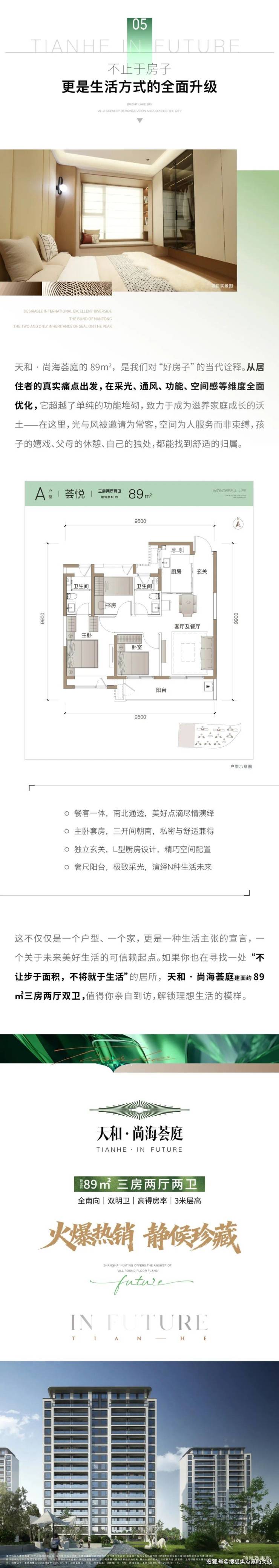 三开间朝南布局,拥有近10米的南向面宽,确保两个卧室与客厅均能沐浴充沛阳光,实现最优通风与采光。约6.3米宽阔阳台延伸了室内外的视觉与生活场景,既可眺望园景,也可作为休闲、种植与社交的灵活空间;双卫配置科学分离使用功能,早晚高峰时段洗漱与沐浴互不干扰,有效化解家庭生活的“时间冲突”,让日常节奏更显从容。在有限的面积中,实现功能、尺度与体验的全面突破,这正是天和产品研发的深厚功力所在,也是赢得众多置业者青睐的关键价值。