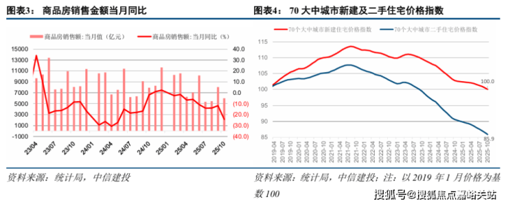 统计局公布2025年10月房地产市场运行情况,10月单月房地产销售面积、投资额、新开工面积、竣工面积分别为6147万平方米、5857亿元、3662万平方米、3732万平方米,同比增速分别为-18.8%、-23.0%、-29.5%、-28.2%,前值分别为-10.5%、-21.3%、-14.4%、+1.5%。