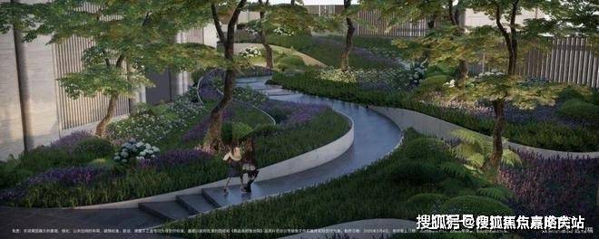 小区做了抬高处理,整体抬高,最高处超过7米,整个小区形成了错落的格局,在小区内部做台地景观。所谓台地,便是将小区内地面整体抬高,与市政道路形成一定的高度落差,这样建造的社区气势磅礴,居高临下。通过景观设计,将小区景打造成了立体台地花园,设置缓坡、下沉式花园、台阶等,让整体景观表现出立体层次感,错落有致。