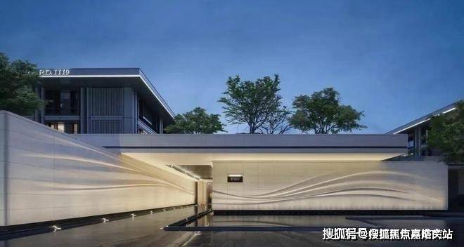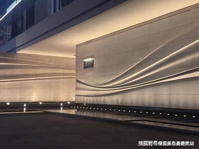 采用米黄色温润石材,巧妙模拟风的流畅形态,营造出既庄重又舒适的归家氛围。这片宽广的流线型石墙在柔和灯光的映衬下,更显璀璨夺目,而风雨连廊的灯带设计,更添一份尊贵仪式感。