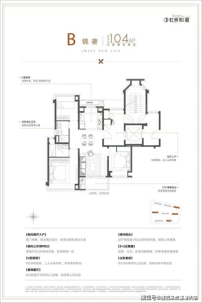 建面约104㎡3房,在建面94㎡小3房优点上,又进一步升级了尺度感,约10.3m的南向面宽,为室内带来了出众的采光面和尺度感,保利虹桥和著售楼处电话➡☎:400 - 8824 - 258【24小时预约快线】这个户型无论从实用性、尺度感,亦或是视野、采光、私密性来说,都做得相当优秀。