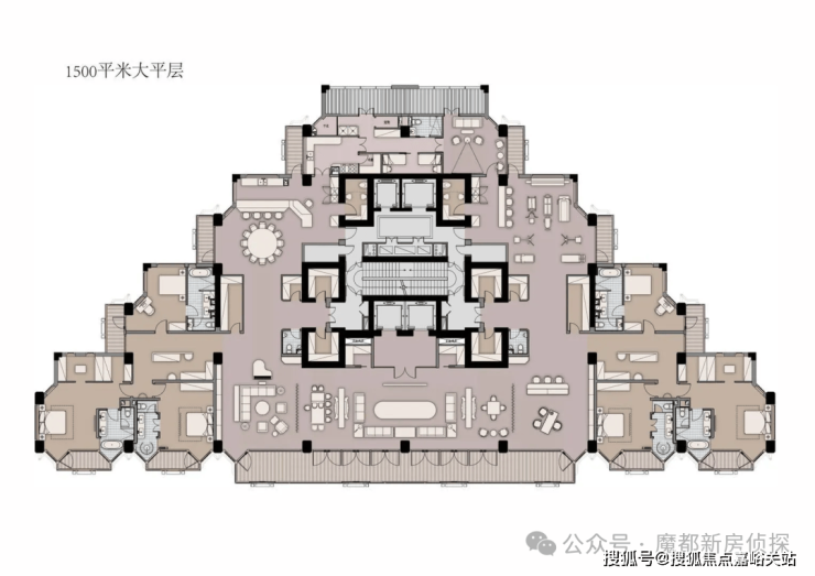 最豪气的还是这个整层一户 建面约1500㎡ 的大平层户型。它南向面宽达60米,有14个阳台!