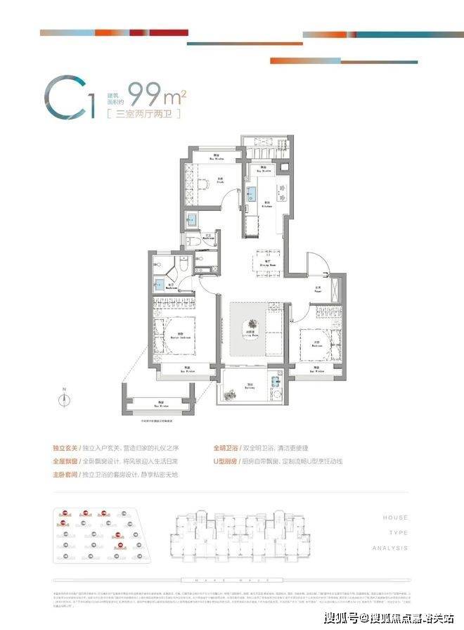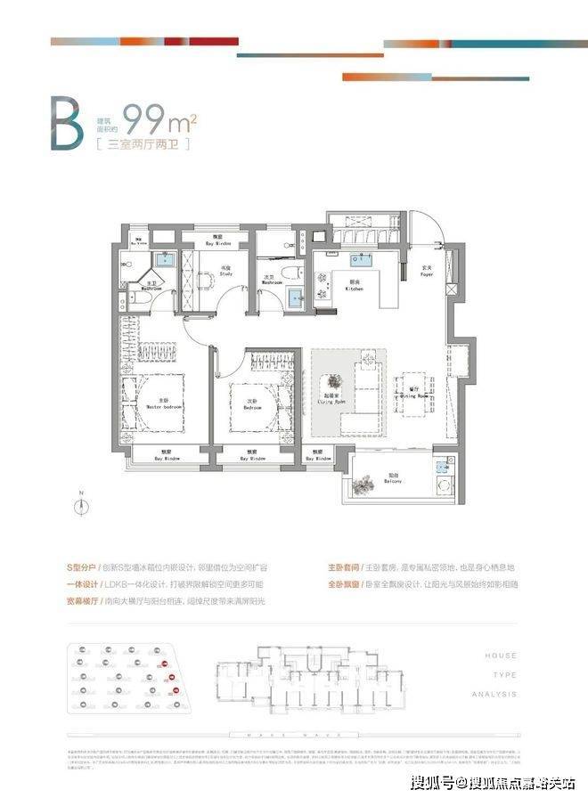 建面约99㎡三房:该户型是典型的飞机格局,很大程度上提高了使用率