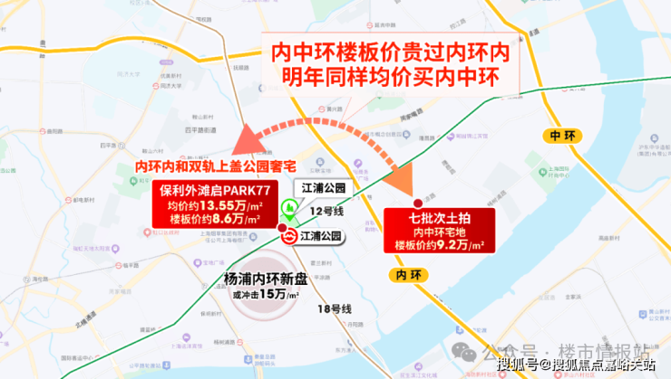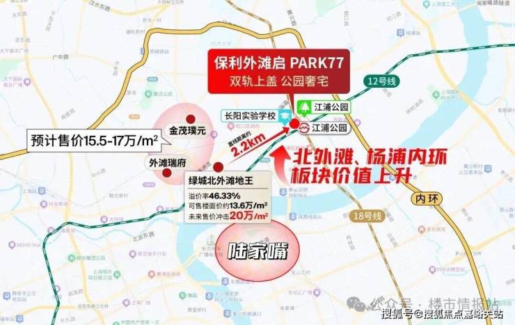 杨浦内环12/18号线江浦公园站双轨上盖, 保利外滩启PARK77火热在售中!总价1200万起!