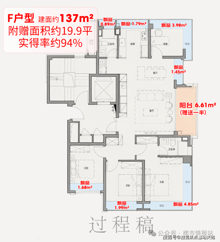 F户型7飘窗,总赠送面积约19.9平,实得率约94%;