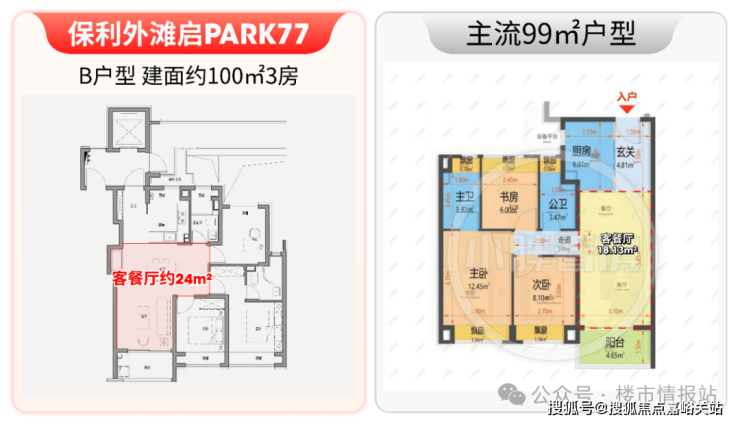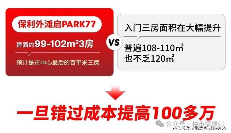当下市场,入门三房面积正大幅扩容,普遍达到108-110㎡,甚至直接跃升至120㎡。而保利外滩启PARK77 建面约99-102㎡3房,堪称市中心最后一批“百平米三房”,一旦错过,购房成本将直接增加100多万!