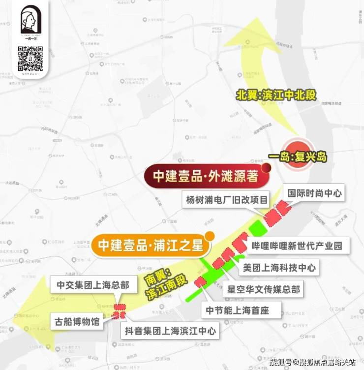 南翼: 即 杨浦滨江南段 ,这里正在打造千亿级总部秀带,目前已经吸引了 中交、抖音、中节能、杨浦滨江创智中心、美团、B站 等数家领军巨头入驻, 预计产业规模超 3000亿元 ,导入至少 20万 人口。