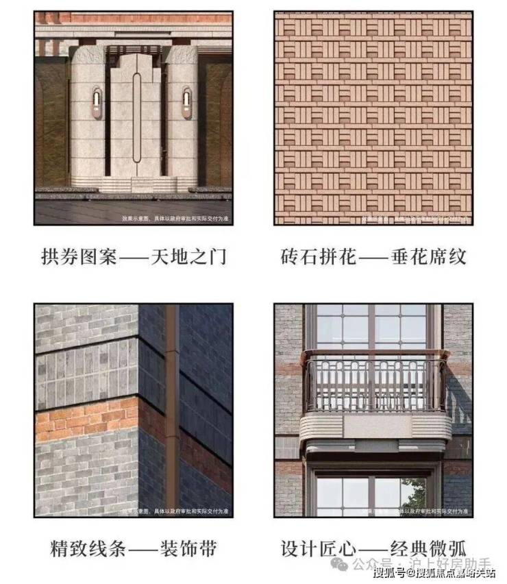 在建筑风格上,项目运用了4大新精致图案,从拱券图案、砖石拼花再到引入了文艺复兴建筑经典手法——刻槽技术,打造建筑装饰带,运用石库门椭圆造型元素,打造前沿建筑符号!